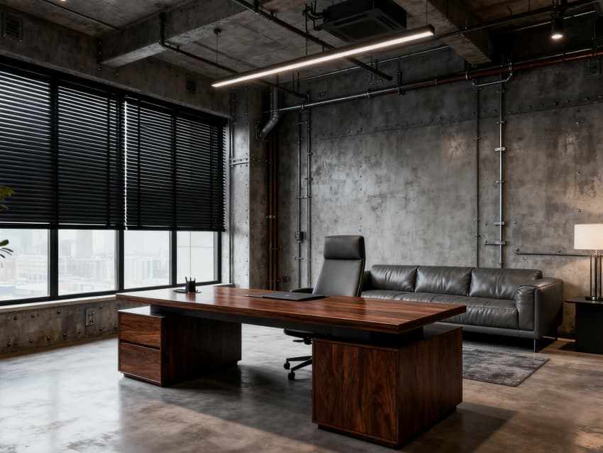 內(nèi)部空間延續(xù)外立面調(diào)性:車間區(qū)鋪深灰防滑耐磨地磚,頂面暴露規(guī)整管線與工業(yè)吊燈,設模塊化承重貨架與設備操作臺,滿足生產(chǎn)需求;辦公區(qū)銜接車間設計,用淺灰地毯與白色吸音吊頂,搭配實木與金屬結(jié)合的辦公家具,弱化工業(yè)冷感;接待區(qū)設水泥肌理前臺,搭配深灰皮質(zhì)沙發(fā);茶水間用不銹鋼臺面與淺灰柜體,適配工業(yè)場景耐用性;走廊鋪淺灰地膠,墻面嵌工業(yè)風導視牌。整體以深灰、淺灰、原木色為基調(diào),通過材質(zhì)呼應,打造生產(chǎn)與辦公融合的專業(yè)空間。