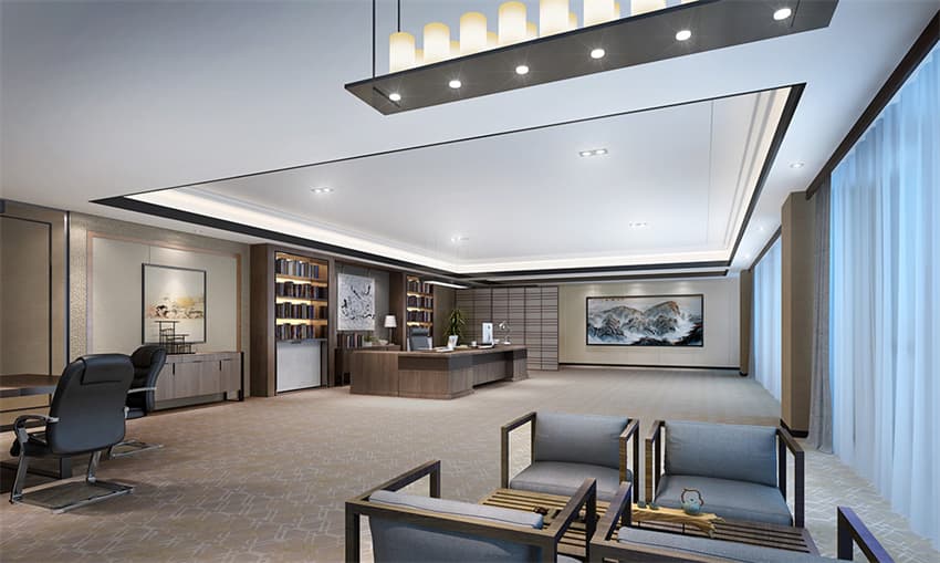 辦公室大氣內(nèi)斂、沉穩(wěn)與活力并存,低調(diào)卻不失奢華,運用皮革材質(zhì)提升整體品質(zhì)感,深色系家具更顯大氣沉穩(wěn)整體呈現(xiàn)一種古典優(yōu)雅的氣質(zhì)。地毯與天花的淺色與家具的深色形成對比,讓空間充滿活力。天花四邊藏光的設計令空間整體氛圍更為和諧。