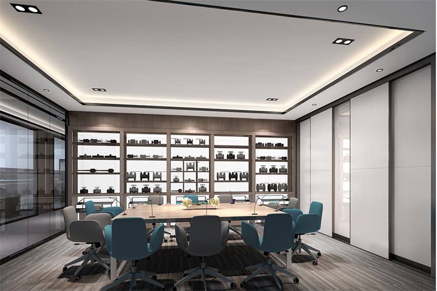 干凈利落,簡單的線條貫穿,通透的大落地玻璃窗,天花透光軟膜的運用,使整個空間的光源更加柔和,不僅增添了明亮視覺感受,也讓員工可一直保持注意力。