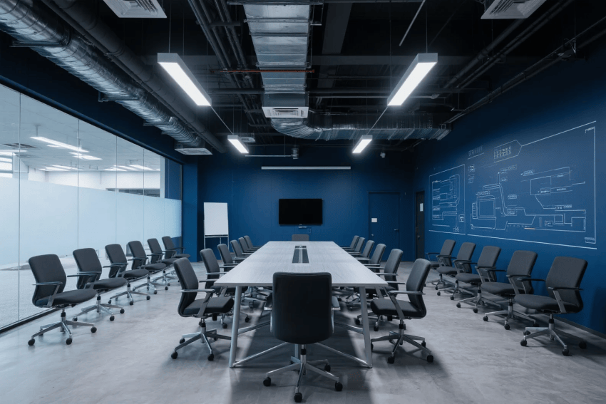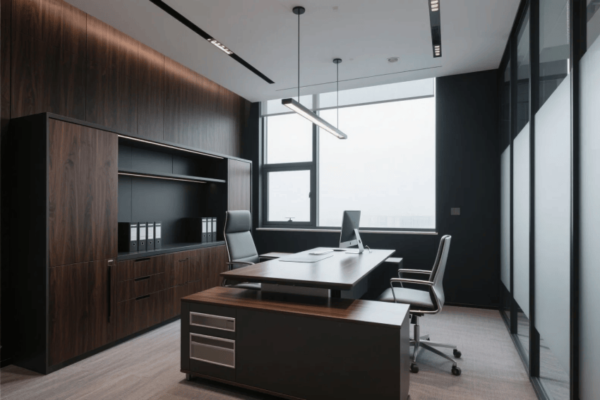 墻面選用深灰藝術(shù)涂料,局部嵌入企業(yè)亮色(如科技藍(lán)或活力橙)的立體品牌標(biāo)識(shí)或線性燈帶,形成鮮明對(duì)比。辦公區(qū)配置黑色鋼架結(jié)構(gòu)的模塊化工位,搭配企業(yè)色跳色的可移動(dòng)儲(chǔ)物柜,既實(shí)用又增強(qiáng)空間活力。會(huì)議室采用深灰玻璃隔斷,內(nèi)部搭配企業(yè)色座椅與定制會(huì)議桌,天花懸掛工業(yè)風(fēng)吊燈,營(yíng)造專(zhuān)注而富有張力的討論氛圍。