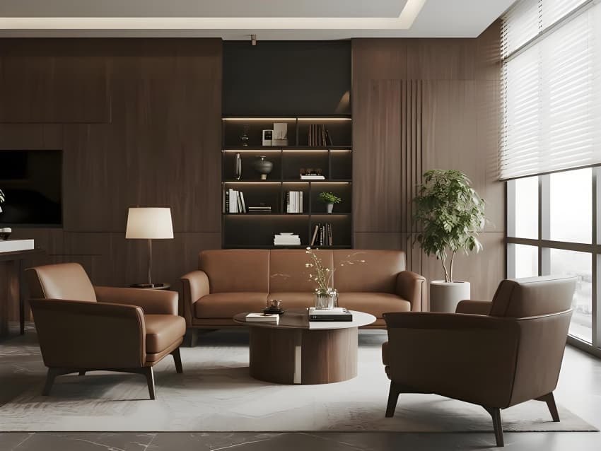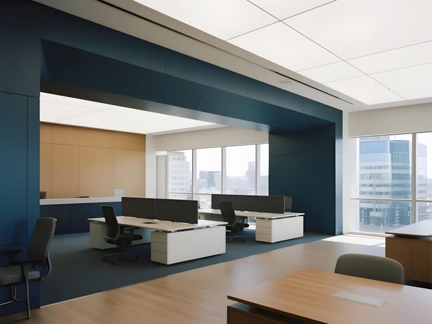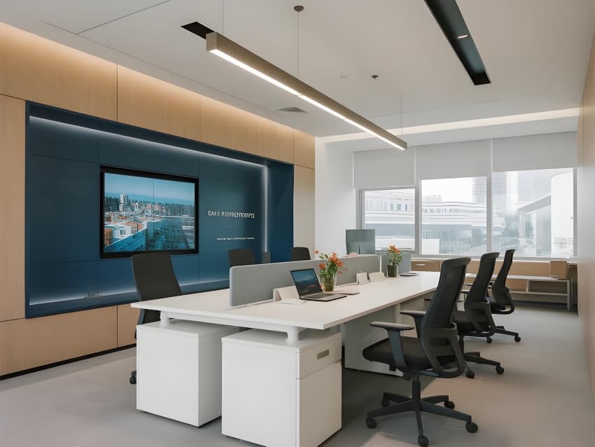 本案以"城市筑夢師"為設(shè)計理念,融合地產(chǎn)專業(yè)性與未來生活美學(xué)。空間采用現(xiàn)代簡約語言,主色調(diào)為高級灰基底,香檳金提升品質(zhì)感,企業(yè)藍強化品牌識別。核心區(qū)域突破傳統(tǒng):大堂變身數(shù)字規(guī)劃館,沙盤區(qū)升級全息城市模型,洽談室植入智能環(huán)境控制系統(tǒng)。