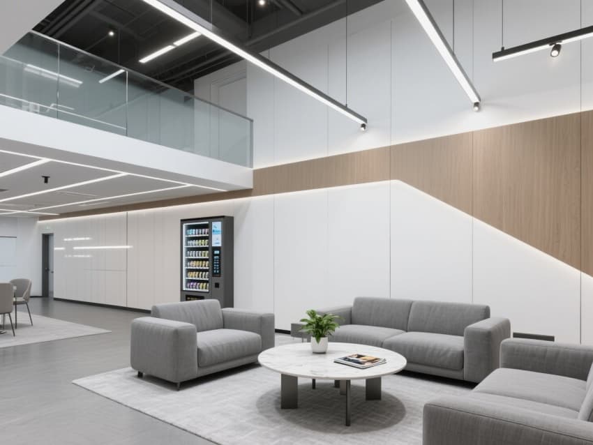 各區(qū)域以隱形收邊工藝與智能中控系統(tǒng)串聯(lián),樓梯間用玻璃護(hù)欄與發(fā)光踏步,走廊嵌智能導(dǎo)視屏。既滿足辦公功能需求,又以極簡(jiǎn)設(shè)計(jì)減少干擾,借科技元素提升效率,打造適配現(xiàn)代企業(yè)的高效智能立體辦公場(chǎng)景。