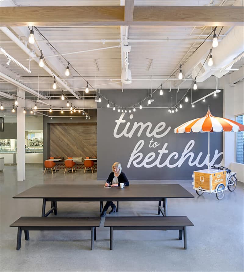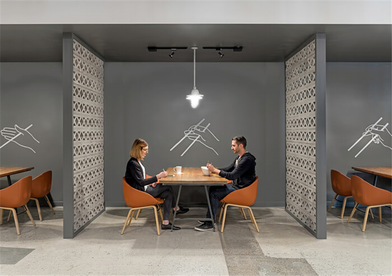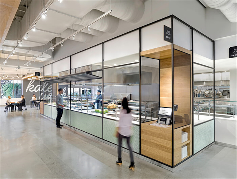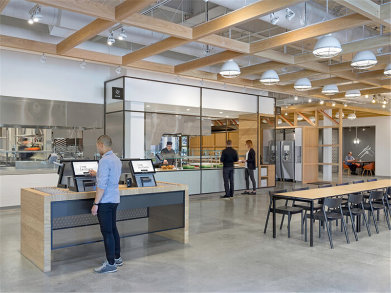 新食物體驗培育社區(qū),也是公司的企業(yè)食堂,是員工們最喜歡來的地方。在食品卡車運動的啟發(fā)下,這個空間通過鼓勵發(fā)現(xiàn)和聯(lián)系來慶祝社區(qū)的多樣性。把食品卡車文化引入內部,把食物區(qū)推到外面,讓員工們可以在空間里進出,發(fā)現(xiàn)各種各樣的文化美食。野餐桌上、冰激凌車、混凝土塊和串燈都營造出了在室外的氛圍。餐廳還有一個無縫的自我訂購系統(tǒng)消除了排隊并鼓勵員工進行社交活動,并提供工作或社交的多種多樣的座位選擇:為大型團體提供的開放式座位,為私密的談話和電話室提供座位,以集中或進行私人會議。