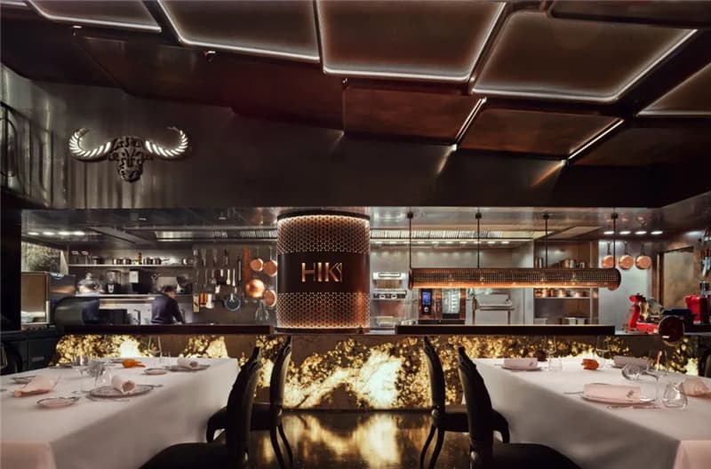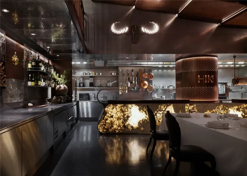 餐廳呈現(xiàn)出都市輕奢與工業(yè)復(fù)古的風(fēng)風(fēng)格性,空間中大量運(yùn)用古銅及黑胡桃木,調(diào)配泛光化的照明,給人溫暖自然的感覺(jué)。餐廳具有選用喜馬拉雅巖鹽制成的干式熟成室、敞開(kāi)的食材儲(chǔ)存區(qū),可以讓客人能直觀地欣賞和挑選食材。