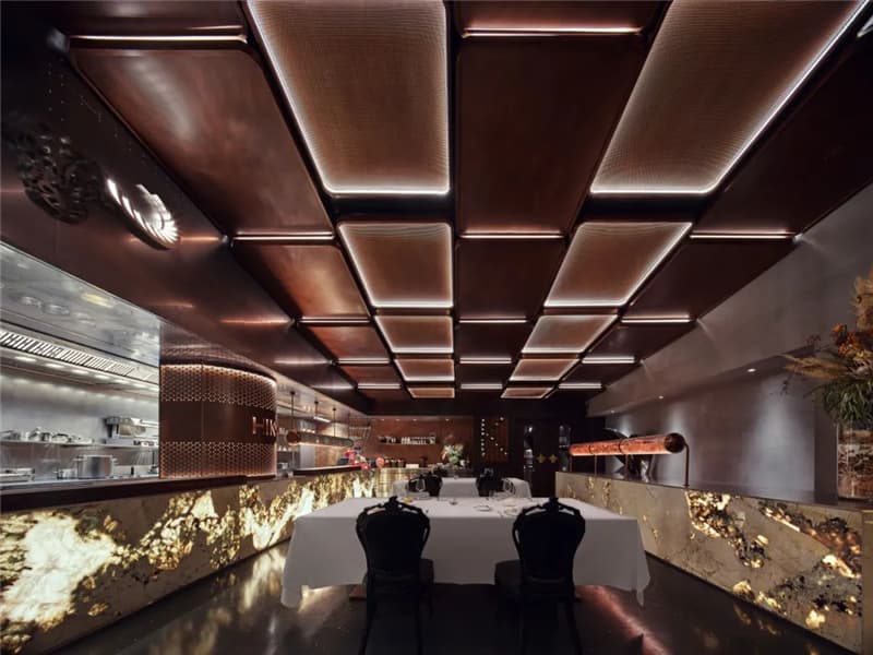 餐廳的斜頂由古銅金屬板和金屬網(wǎng)交替拼接而成,營(yíng)建出虛實(shí)相融的現(xiàn)象,使得空間的層次感既豐富又頗為值得考究。網(wǎng)狀結(jié)構(gòu)在線性燈帶的烘托下,將模糊的美感盡然發(fā)表,使得用餐的氣氛更佳。