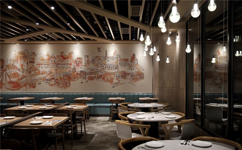 空間處處凝煉“披薩專家和新鮮美食”的品牌觀,大幅的披薩小鎮(zhèn)插畫,將美食的生命力定格于空間場(chǎng)景,炊具和食材創(chuàng)意陳列,讓食客直接與食物對(duì)話,增進(jìn)親密體驗(yàn)。