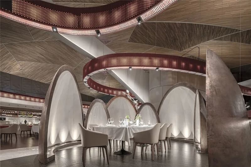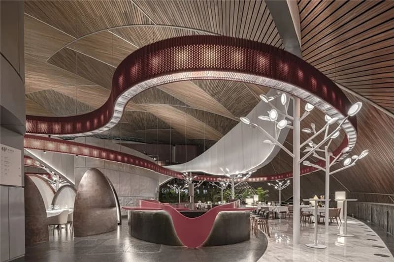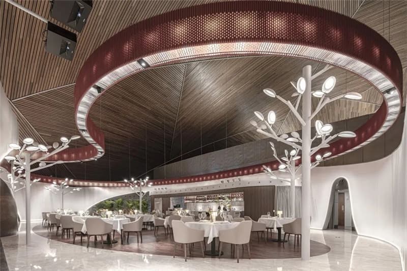 ?、苎鐣d的地面經(jīng)常鋪設(shè)暖色調(diào)的地毯,墻面裝飾通常使用吸音性能較好的壁紙、織物軟包,吊頂應(yīng)結(jié)合建筑結(jié)構(gòu)、梁柱的位置與大小來進(jìn)行餐廳設(shè)計。