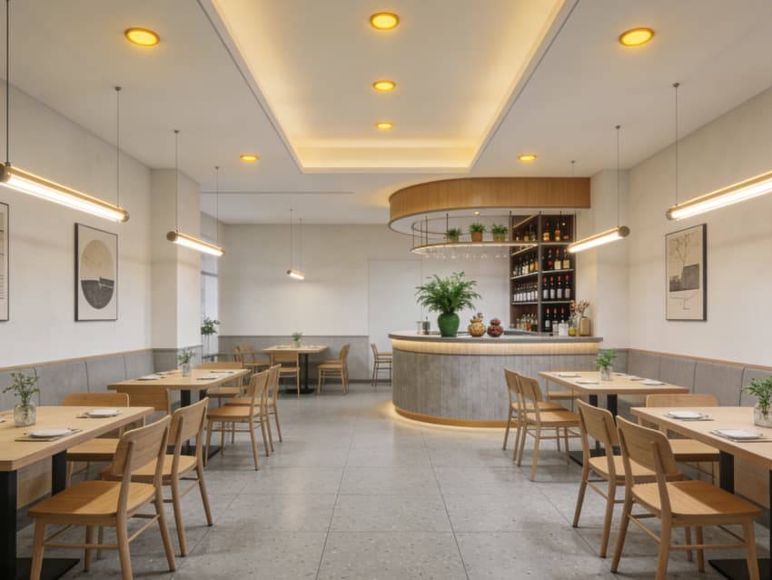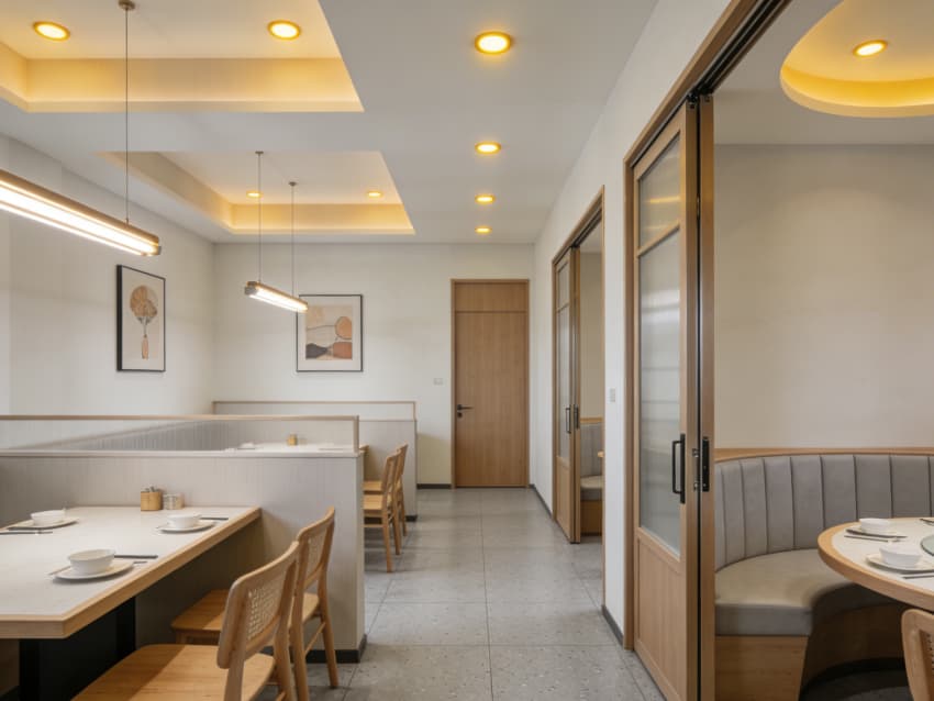 整體空間采用簡(jiǎn)約原木風(fēng)設(shè)計(jì)語(yǔ)言,以淺橡木、米灰色為基底,搭配暖橙色燈光與軟質(zhì)軟裝,營(yíng)造出溫暖松弛的氛圍。頂面層次分明的燈光系統(tǒng)是空間的點(diǎn)睛之筆:嵌入式筒燈保障基礎(chǔ)照度,線(xiàn)性吊燈勾勒空間縱深感,卡座下方的氛圍燈帶則強(qiáng)化了私密感與舒適感,暖調(diào)光線(xiàn)既提升食欲,又讓用餐場(chǎng)景更具治愈感。