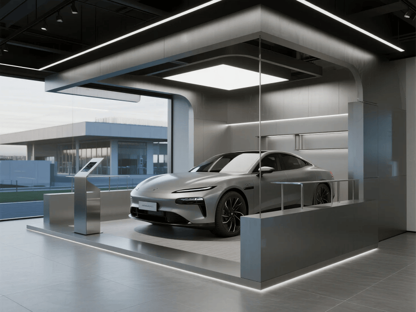 展廳以"機械藝術(shù)×人文奢享"為核心理念,采用工業(yè)美學與輕奢主義的跨界融合。空間以鈦空灰為主基調(diào),搭配香檳金與深海藍跳色,材質(zhì)上運用航空鋁、意大利洞石與防眩目超白玻構(gòu)建高級質(zhì)感。設計突破傳統(tǒng)4S店模式,通過"博物館式展陳+私人會所服務"的雙動線布局,將科技體驗(如全息引擎拆解秀)與人文細節(jié)(手工皮具展示墻)完美結(jié)合。燈光采用博物館級軌道射燈與可變色溫線性光源,精準控制不同車型的戲劇化呈現(xiàn)。特別設置"聲學優(yōu)化區(qū)"模擬引擎轟鳴,同時通過智能霧化玻璃實現(xiàn)展車模式的瞬間切換。整體既彰顯機械精密之美,又營造出頂級社交空間的尊貴感,重新定義高端汽車零售體驗。