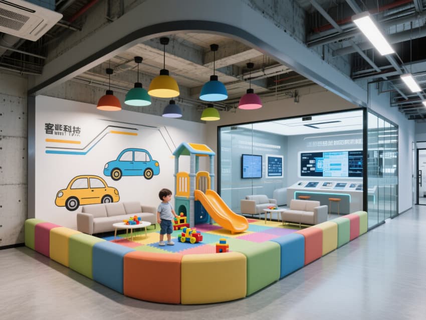 車輛展示區(qū)采用超高挑高設(shè)計(jì),地面鋪設(shè)無(wú)縫環(huán)氧地坪,搭配可調(diào)節(jié)軌道射燈,精準(zhǔn)照亮車身線條;洽談區(qū)以半通透金屬網(wǎng)隔斷,配備嵌入式智能交互屏的桌椅,墻面嵌入品牌文化數(shù)字展墻。維修區(qū)地面做防滑耐磨處理,天花懸掛工業(yè)風(fēng)管線式吊燈,設(shè)備收納柜采用模塊化設(shè)計(jì),與墻面齊平保持整潔。?