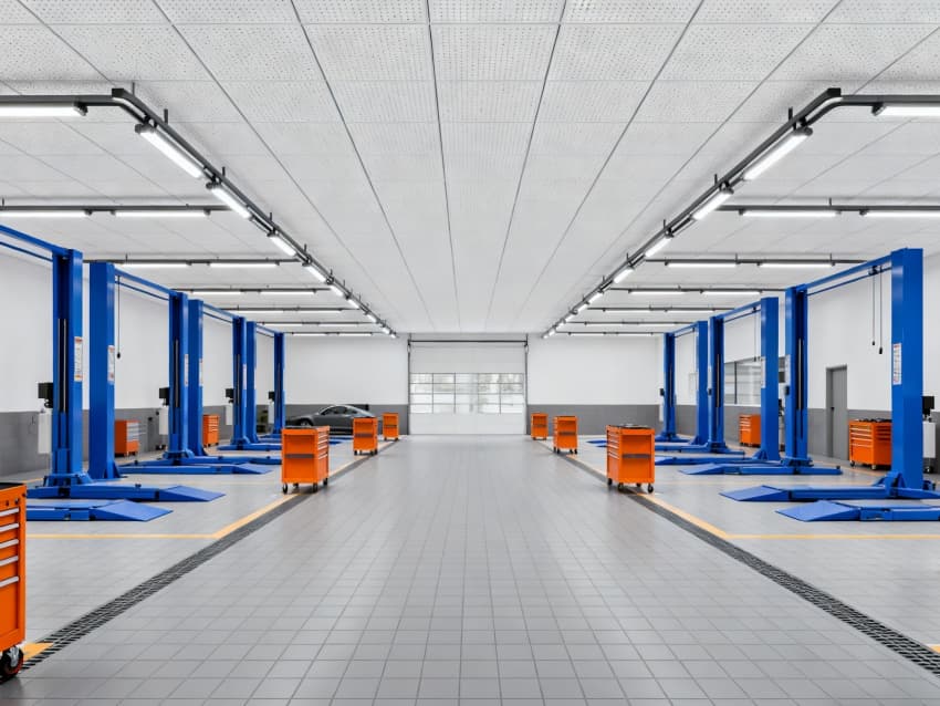 內(nèi)部設(shè)計(jì)緊扣“功能分區(qū)與體驗(yàn)升級(jí)”:一層(約1200㎡)為展車與銷售區(qū),淺灰啞光地磚搭配白色懸浮吊頂,展車位預(yù)留充電接口與車型講解屏,接待區(qū)用淺灰布藝沙發(fā)與金屬邊茶幾,弱化商業(yè)感;二層(約800㎡)為客戶休息與售后辦公區(qū),設(shè)影音室、茶歇區(qū)與透明售后觀察窗,客戶可實(shí)時(shí)查看車輛維修進(jìn)度;后側(cè)(約600㎡)為售后車間,鋪耐磨環(huán)氧地坪,設(shè)備分區(qū)規(guī)整,墻面設(shè)安全警示標(biāo)識(shí),兼顧操作規(guī)范與視覺整潔。?