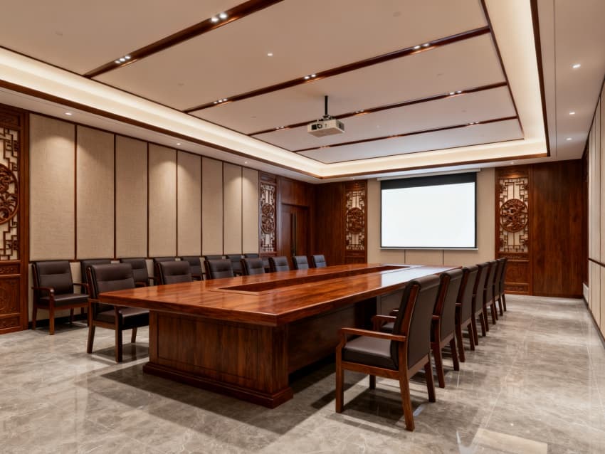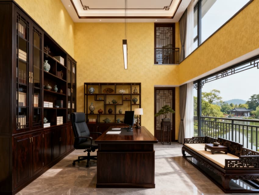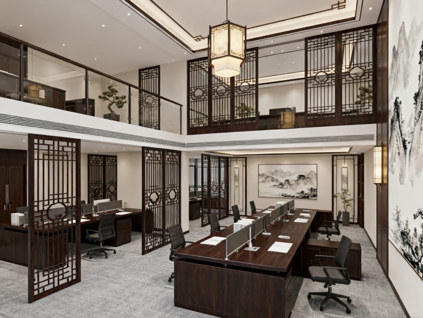 內(nèi)部設(shè)計(jì)緊扣“分層功能適配與文化融入”:一層(800㎡)為公共接待層,設(shè)前臺(tái)、訪客休息區(qū)、展示廳與小型會(huì)議室,地面鋪淺灰大理石,墻面掛水墨風(fēng)格裝飾畫,前臺(tái)背景墻采用實(shí)木格柵與石材拼接,展示廳陳列企業(yè)榮譽(yù)與文化展品,營(yíng)造莊重又親和的接待氛圍;二層(800㎡)為核心辦公層,設(shè)開(kāi)放式工位與部門獨(dú)立辦公室,淺木色辦公家具搭配米白軟裝,吊頂嵌入中式紋樣燈帶,工位間用矮屏風(fēng)分隔,兼顧協(xié)作與隱私,茶水間設(shè)實(shí)木操作臺(tái)與中式茶具,傳遞人文關(guān)懷;三層(800㎡)為私密決策層,布局高管辦公室、戰(zhàn)略會(huì)議室與休息室,高管辦公室配備獨(dú)立茶歇區(qū),會(huì)議室采用實(shí)木圓桌與真皮座椅,墻面設(shè)嵌入式書柜,整體色調(diào)偏沉穩(wěn),凸顯決策空間的莊重感。?