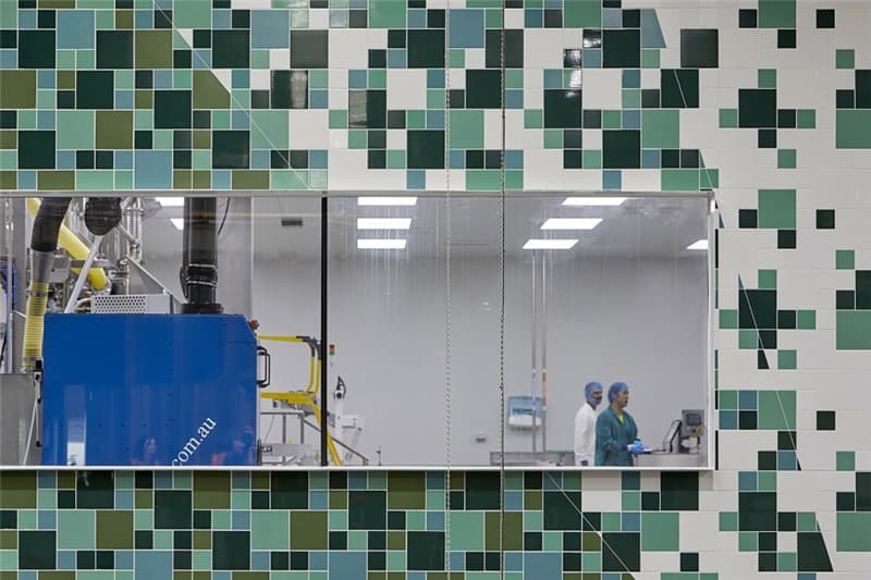 多彩的線條從附近的自然保護(hù)區(qū)一直延伸到位于生產(chǎn)區(qū)核心地帶的巨型壁畫上,吸引著員工和參觀工廠的訪客。產(chǎn)自本地的澳洲硬木和紋理豐富的墻面從外部景觀“流進(jìn)”室內(nèi),在自然光線的配合下營造出富有生機(jī)的氛圍。