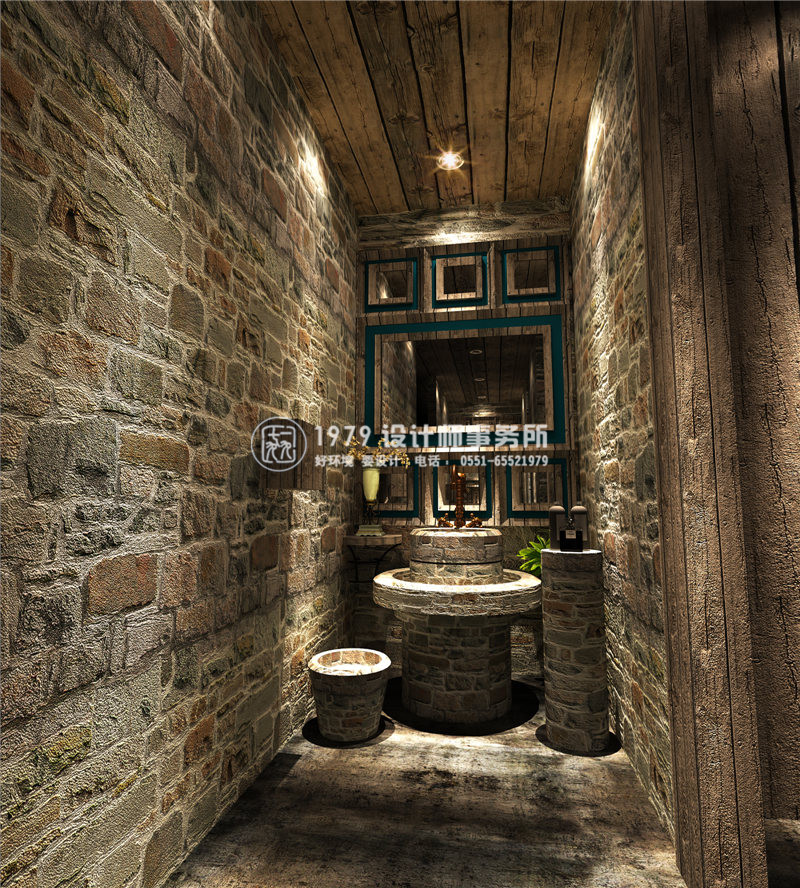 洗手間,原生態(tài)的磚石墻壁水泥地面,隱私之余充滿新意。木框的鏡子在柔和燈光的照射下更能襯托動(dòng)人的膚色。