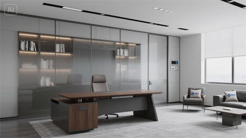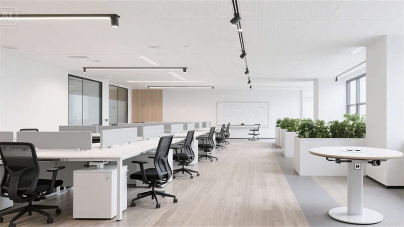 開放式辦公區(qū)以可升降桌、協(xié)作島與高吧臺休憩區(qū)構建靈活場景,穿孔吸音天花與淺木紋PVC地板弱化工業(yè)冷感;獨立辦公室通過灰玻隔斷與胡桃木家具平衡隱私與通透感。公共支持區(qū)、標準會議室等空間,均以啞光金屬、淺灰肌理漆等統(tǒng)一材質串聯(lián),配合3500K色溫燈光,形成連貫的視覺呼吸節(jié)奏。