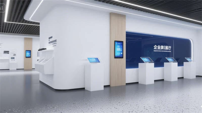 建筑外立面以流線型玻璃幕墻與啞光金屬線條勾勒科技輪廓,底部垂直綠植墻與光伏玻璃的融合,將生態(tài)可持續(xù)理念嵌入第一視覺印象。通透的挑高入口與室內大堂形成光影聯(lián)動,淺白色大理石地面、懸浮式線性燈光與深藍色企業(yè)LOGO墻,以克制的色彩系統(tǒng)傳遞品牌調性,同時通過數字屏顯墻實現(xiàn)空間敘事動態(tài)化。
