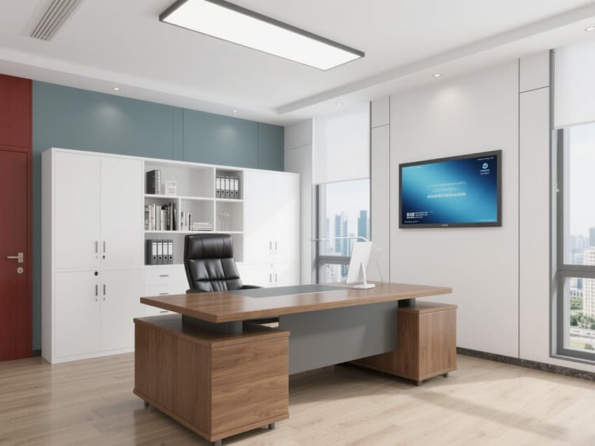 這套辦公設計巧妙融合現(xiàn)代簡約與新中式美學,打造出雅致且高效的辦公空間。前臺以大理石接待臺為核心,搭配藍白紅撞色背景墻與精致品牌標識,盡顯專業(yè)大氣的第一印象。開放辦公區(qū)采用玻璃隔斷保障采光,簡潔的桌椅布局與中式裝飾畫相得益彰,既營造出通透協(xié)作的工作氛圍,又傳遞出文化韻味。總經理辦公室通過木質辦公家具、充足自然光線及城市景觀窗,平衡了商務穩(wěn)重與開闊舒適感。會議室配備專業(yè)投影設備,燈光與材質的搭配讓空間兼具專業(yè)與溫馨,滿足高效會議需求。此外,休閑區(qū)的現(xiàn)代吧臺、舒適座椅,以及新中式洽談區(qū)的山水掛畫、格柵隔斷,為員工與客戶提供了放松交流的雅致場所,整體設計在功能與美學間實現(xiàn)了精妙平衡。