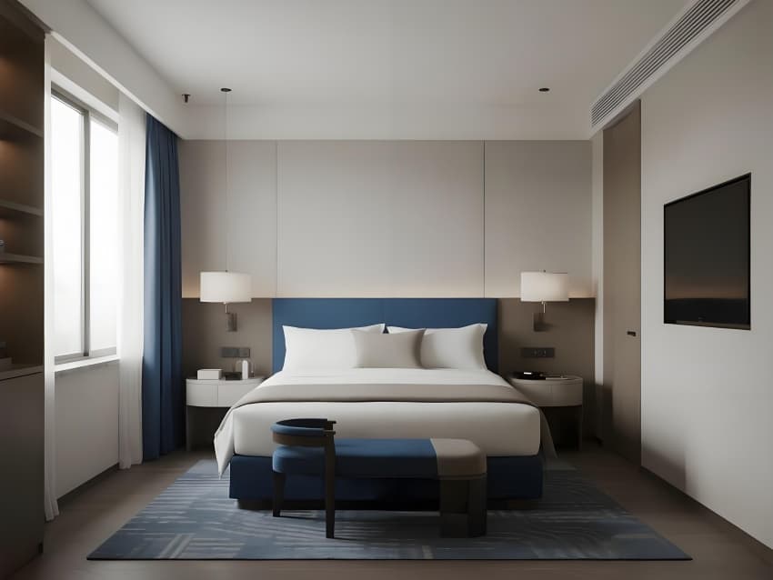科技系統(tǒng)優(yōu)雅隱匿:無(wú)感入住人臉識(shí)別,環(huán)境音樂(lè)分區(qū)調(diào)控,客房魔鏡交互系統(tǒng)。材質(zhì)精選微水泥、再生金屬網(wǎng)、聲學(xué)織物,在克制美學(xué)中暗藏驚喜。最終呈現(xiàn)一個(gè)既具商務(wù)效率又有藝文溫度的城市棲息地。