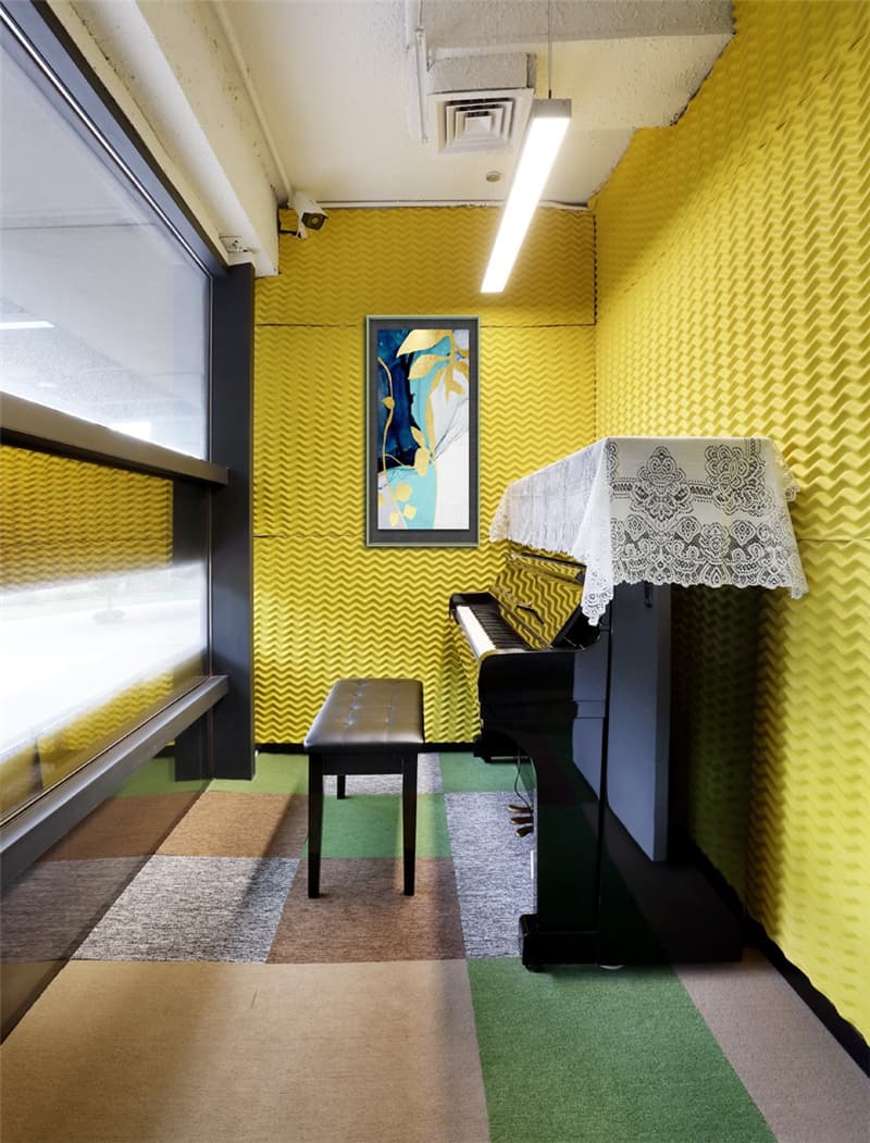 前廳設(shè)計(jì)簡(jiǎn)潔大方,背景墻設(shè)計(jì)靈感來自木屋與琴鍵,回歸自然,放飛心靈,這里是孩子音樂旅程的港灣.