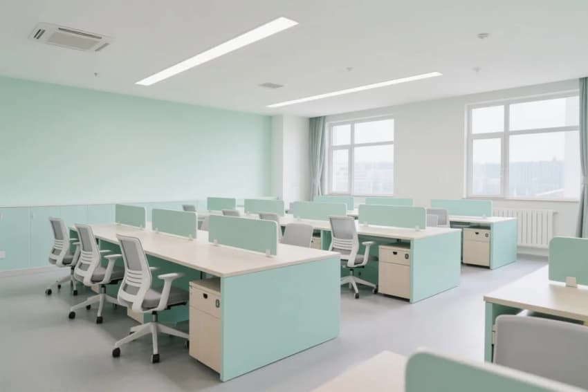 本案以“探索·共生”為設(shè)計哲學,采用未來教育綜合體的架構(gòu)。空間以靈動多變的藍綠主色調(diào)串聯(lián),搭配木紋質(zhì)感與科技灰,形成理性與活力的碰撞。