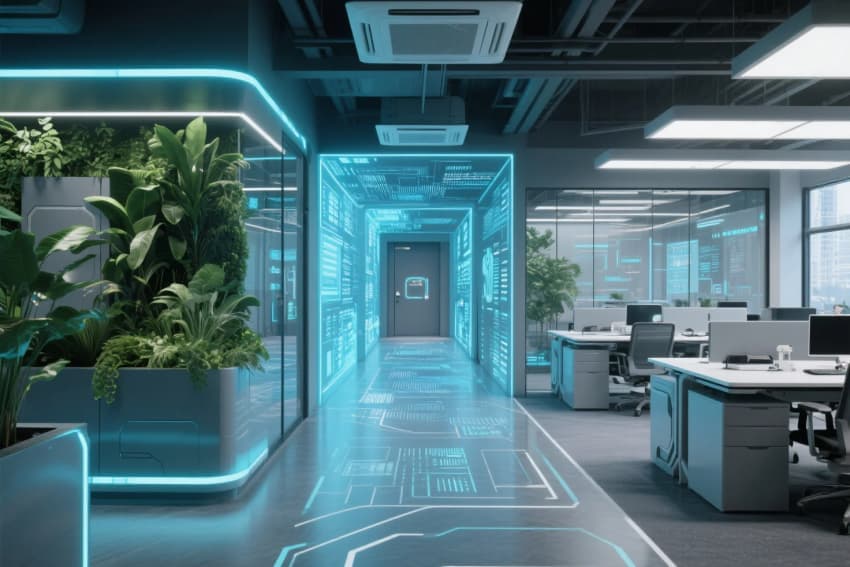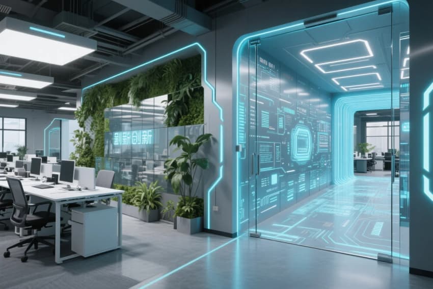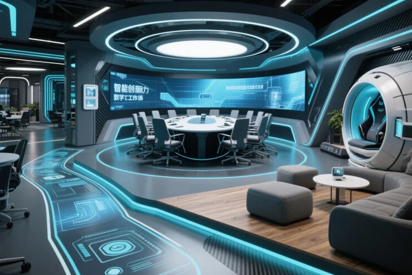 設(shè)計以"科技感、開放協(xié)作、智能高效"為核心理念,打造激發(fā)創(chuàng)新力的數(shù)字工作空間。整體采用太空灰與電子藍主色調(diào),融入賽博朋克元素與生態(tài)綠植的碰撞。入口以全息投影走廊與動態(tài)數(shù)據(jù)流墻面塑造科技第一印象,開放辦公區(qū)采用模塊化升降工作站與透明玻璃編程墻。核心區(qū)設(shè)置VR會議室,配備曲面環(huán)繞屏與智能聲控系統(tǒng),休閑區(qū)植入太空艙冥想室與電競減壓角。材質(zhì)上融合碳纖維飾面、導(dǎo)光亞克力與再生木材,路徑通過交互式地屏智能引導(dǎo),整體構(gòu)建一個兼具硬核科技與人文關(guān)懷的創(chuàng)新工場。