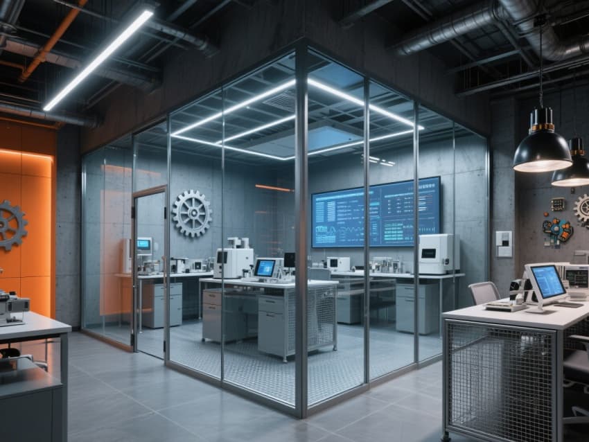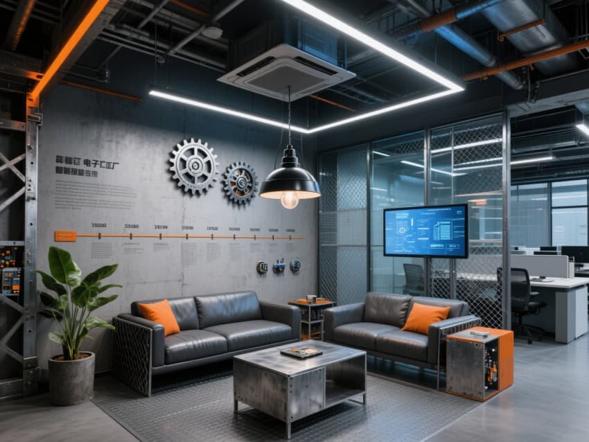 以科技工業(yè)風(fēng)與現(xiàn)代辦公美學(xué)的融合為核心,構(gòu)建起統(tǒng)一的理性空間體系。主色調(diào)選用深灰、淺銀與科技藍(lán),通過裸露的金屬桁架與玻璃隔斷劃分功能區(qū),天花管線采用統(tǒng)一的淺灰色噴涂,與地面防靜電水磨石形成材質(zhì)呼應(yīng)。?