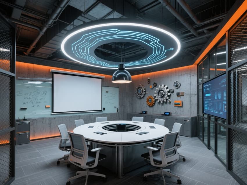 開放式辦公區(qū)配備模塊化升降工位,桌面嵌入無線充電模塊,立柱包裹仿電路板紋理的金屬面板。會(huì)議室以雙層中空玻璃圍合,墻面設(shè)置電子屏與可書寫玻璃結(jié)合的展示系統(tǒng),休閑區(qū)的座椅造型借鑒電子元件輪廓。?