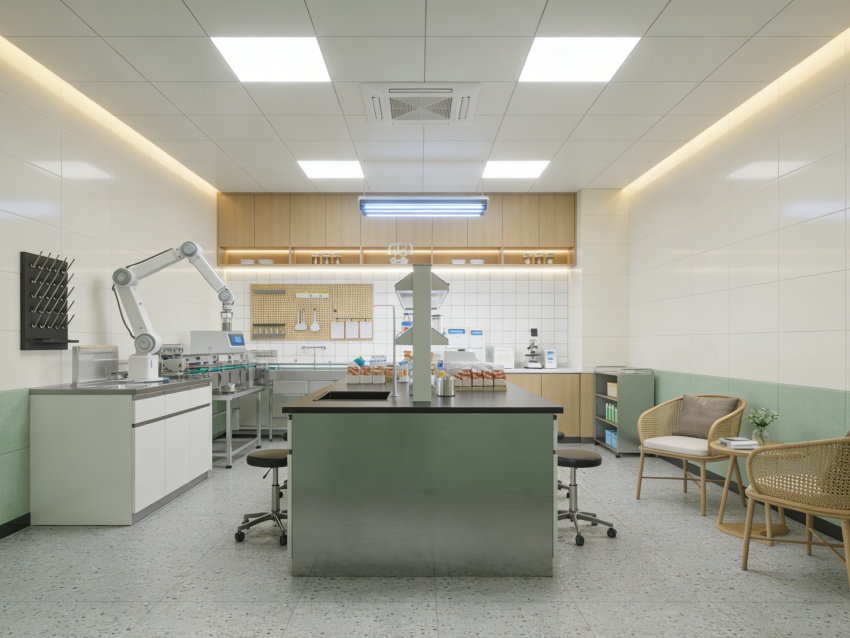 整體以淺灰、米白為基調(diào),搭配局部淺綠點綴,呼應(yīng)農(nóng)產(chǎn)品自然屬性。材質(zhì)選用食品級不銹鋼、耐磨耐污工業(yè)板材及防滑地磚,符合衛(wèi)生規(guī)范與生產(chǎn)耐磨需求。墻面簡潔平整,局部設(shè)置標(biāo)識牌引導(dǎo)動線,燈光采用均勻漫射設(shè)計,保障生產(chǎn)與檢測照明充足。各空間通過密封隔斷與專用廊道銜接,既保障生產(chǎn)流程有序,又強化衛(wèi)生防護(hù),實現(xiàn)實用功能與統(tǒng)一風(fēng)格的深度融合。