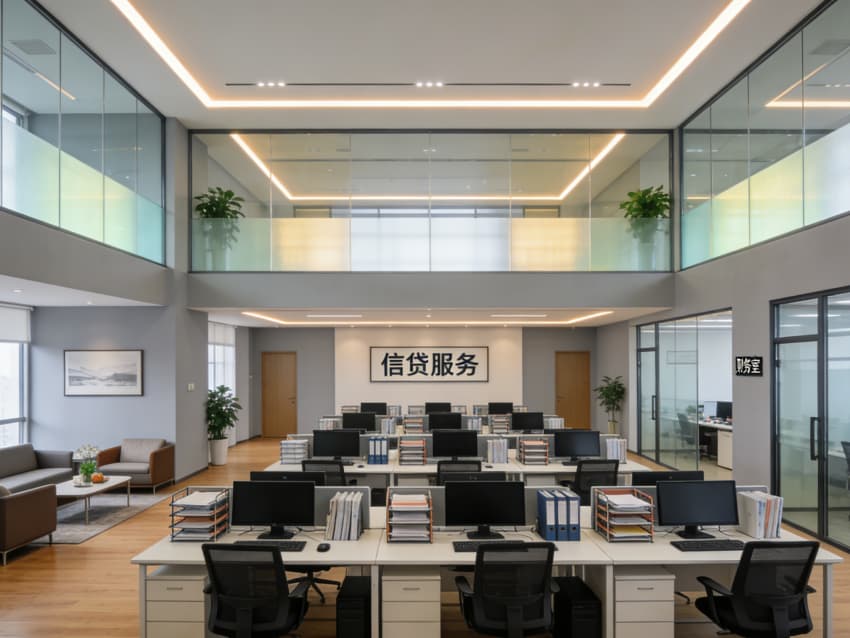 會(huì)議與風(fēng)控區(qū):全玻璃隔斷會(huì)議室配備高清投影與視頻會(huì)議系統(tǒng),支持貸前評(píng)審、風(fēng)控研討等嚴(yán)肅場(chǎng)景;墻面“誠(chéng)信信貸、服務(wù)至上”等標(biāo)語(yǔ)強(qiáng)化團(tuán)隊(duì)合規(guī)意識(shí),適配信貸業(yè)務(wù)的風(fēng)險(xiǎn)管控需求。