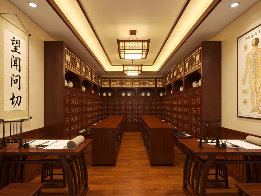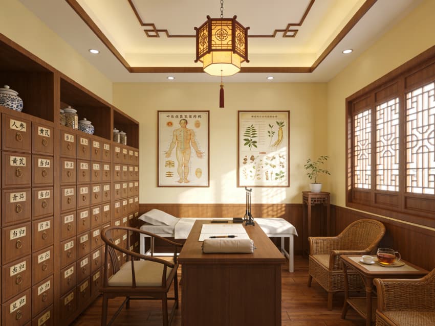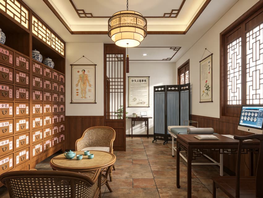 空間采用新中式風(fēng)格,以實(shí)木榫卯家具、仿古花格窗與水墨書畫為核心元素,搭配暖黃的中式吊燈與自然天光,營造出古樸雅致的診療氛圍。深胡桃木色的藥柜、診桌與淺米色墻面形成冷暖平衡,藤編座椅與陶瓷擺件增添自然質(zhì)感,既還原了傳統(tǒng)中醫(yī)館的韻味,又通過簡約線條弱化了厚重感,讓空間兼具古韻與通透。