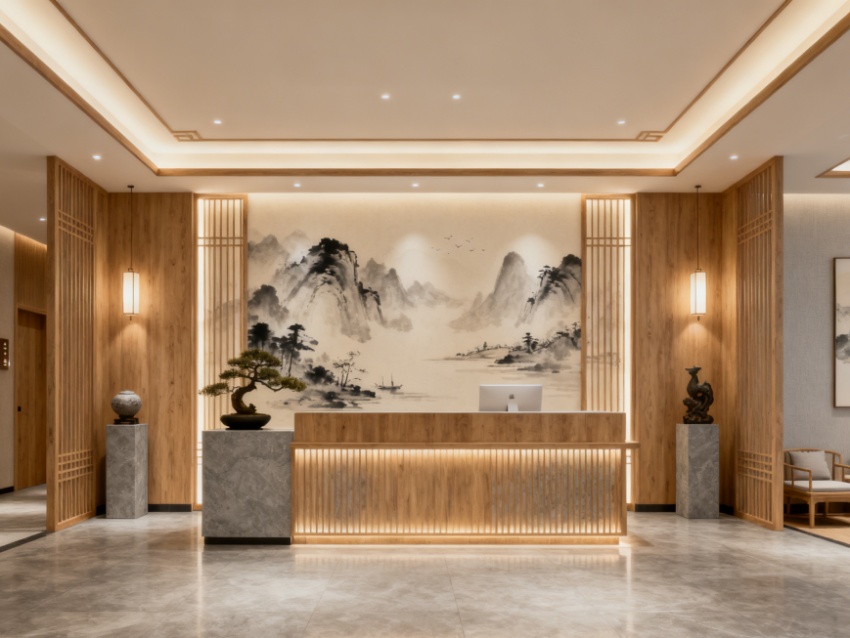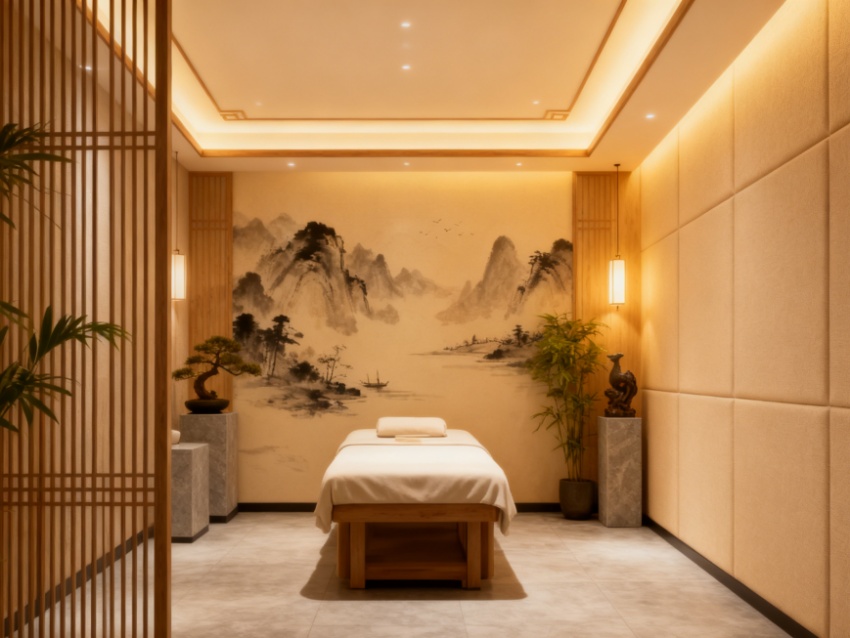 本2500㎡足浴養(yǎng)生會所以“禪意東方?靜謐療愈”為核心,實(shí)現(xiàn)外立面與內(nèi)部空間的風(fēng)格統(tǒng)一及功能適配。外立面采用淺米黃石材搭配深棕色木格柵,融入圓月造型裝飾與垂直綠植,既彰顯雅致格調(diào),又傳遞自然養(yǎng)生理念,與內(nèi)部禪意氛圍形成呼應(yīng)。?