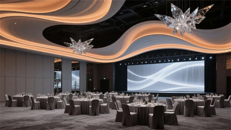 全日餐廳以陶土色格柵天花呼應(yīng)徽州傳統(tǒng)工藝,吹制玻璃吊燈如晨露凝結(jié)空中;宴會(huì)廳則化身未來劇場(chǎng),波浪形織物天花與全息投影幕布共舞光影。行政樓層的商務(wù)休息區(qū),深灰毛氈墻面與古銅金屬細(xì)節(jié)沉淀出理性優(yōu)雅,窗外綠意透過玻璃隔斷滲入交談空間。從屋頂無邊泳池俯瞰,建筑與巢湖的瀲滟水色遙相呼應(yīng),于繁華處開辟一方隱逸凈土——這里不僅是居所,更是一場(chǎng)喚醒感官的設(shè)計(jì)敘事。