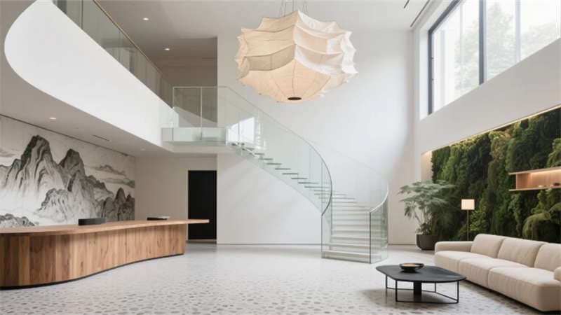 步入挑高的大堂,原木與石材的碰撞詮釋著質(zhì)樸的高級(jí)感。懸浮玻璃樓梯如透明絲帶盤旋而上,紙藝褶皺吊燈灑下柔和光暈,綠植墻在隱藏式燈光中若隱若現(xiàn),仿若一幅當(dāng)代山水畫卷。客房以暖灰與米白為基調(diào),亞麻、微水泥與天然木紋織就療愈氛圍,弧形沙發(fā)與嵌入式燈帶讓空間流動(dòng)著溫柔詩意,落地窗將城市天際線化為朦朧背景。