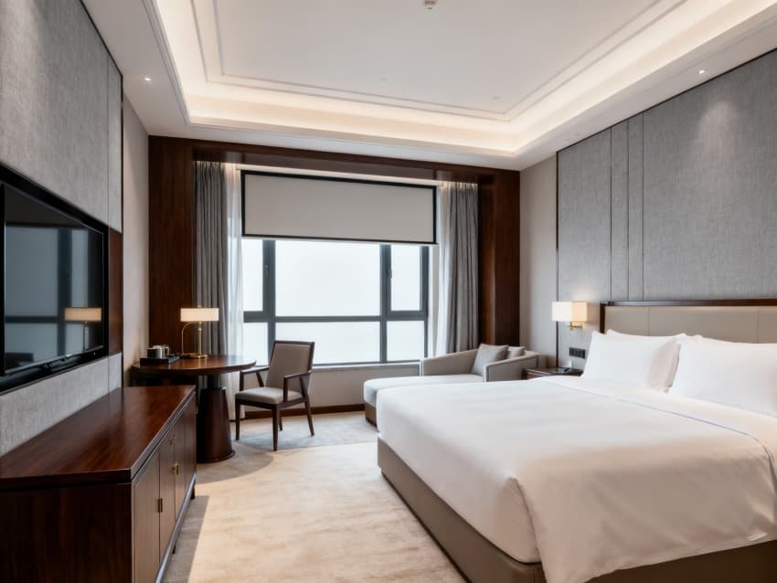 內(nèi)部空間延續(xù)外立面的輕奢調(diào)性:大堂用米白大理石地面搭配深棕實(shí)木接待臺(tái),金屬吊燈提升精致度;客房以淺灰軟裝搭配米白墻面,深棕木質(zhì)家具增添溫潤(rùn)感;餐廳用淺金金屬隔斷劃分區(qū)域,米白餐桌搭配灰色餐椅,簡(jiǎn)約又顯格調(diào);休閑區(qū)用淺灰布藝沙發(fā)搭配玻璃茶幾,綠植點(diǎn)綴增添生機(jī);走廊采用淺灰地毯與米白墻面,壁燈暖光營(yíng)造靜謐氛圍。整體通過統(tǒng)一的色彩與材質(zhì),打造出舒適高端的住宿體驗(yàn)。