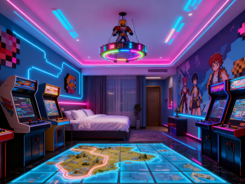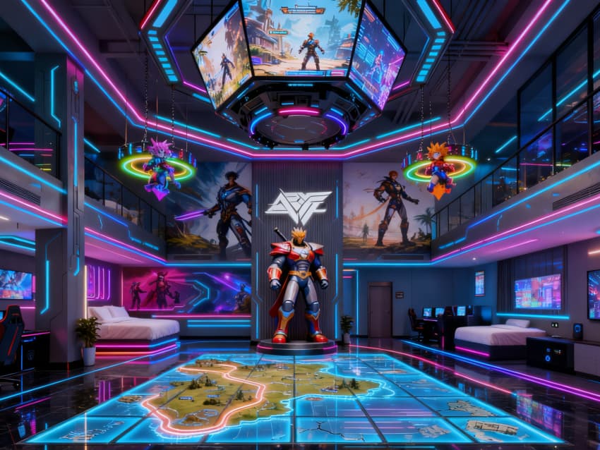 整體以科技藍(lán)、霓虹紫為基調(diào),搭配游戲IP專屬配色,材質(zhì)選用耐磨防滑的工業(yè)風(fēng)地磚、防刮耐磨壁紙,墻面嵌入游戲場景壁畫與發(fā)光LOGO。6100㎡空間動線流暢,各區(qū)域通過IP元素自然銜接,既滿足玩家電競娛樂與住宿需求,又通過細(xì)節(jié)打磨強(qiáng)化主題沉浸感,實(shí)現(xiàn)潮流電競與IP文化的深度融合。
