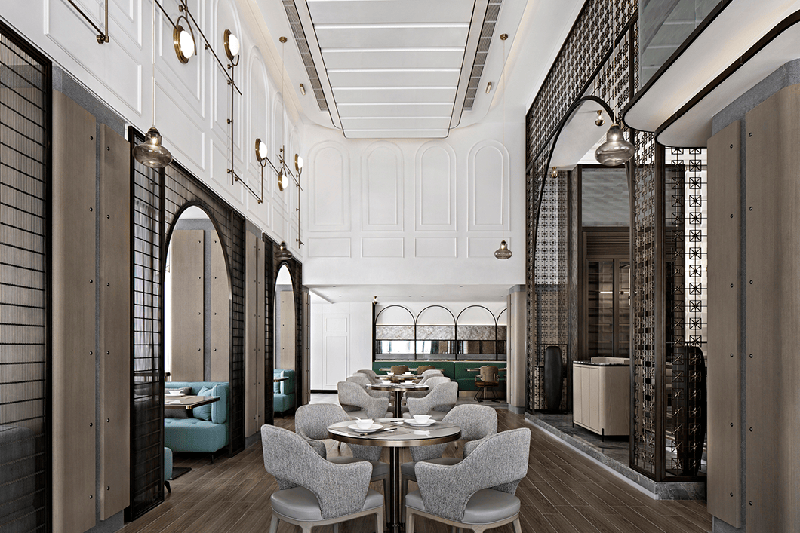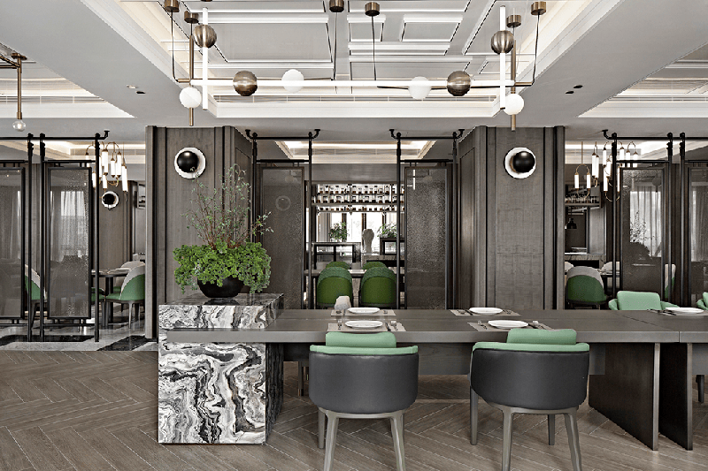 在色彩的運用上搭配淡色系為主色調(diào),既體現(xiàn)出餐廳的品質(zhì)感,又能讓人感受到賓至如歸的熱情。