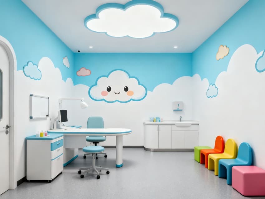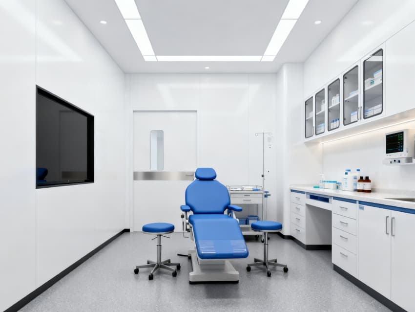 內(nèi)部空間延續(xù)外立面調(diào)性:診療區(qū)用淺灰色防靜電地板與白色無(wú)菌吊頂,模塊化診療臺(tái)搭配淺藍(lán)醫(yī)用軟包,兼顧操作便捷與患者舒適;候診區(qū)以淺灰布藝沙發(fā)搭配白色茶幾,綠植與暖光臺(tái)燈緩解等待焦慮;消毒室采用淺灰不銹鋼柜體與白色墻面,分區(qū)收納保障無(wú)菌標(biāo)準(zhǔn);咨詢室用淺木色桌椅搭配淺灰墻面,營(yíng)造溫和溝通氛圍;走廊鋪淺灰防滑地磚與米白墻面,線性燈帶與清晰導(dǎo)視提升通行效率。整體通過(guò)材質(zhì)、功能的協(xié)調(diào),打造專業(yè)且舒適的診療環(huán)境。