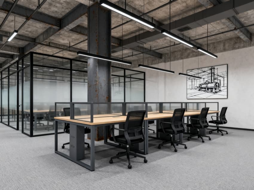 開放式辦公區(qū):地面鋪淺灰亞麻紋地膠,工位為深灰金屬框架+淺木色桌面,搭配黑色辦公椅,隔斷用黑色金屬框架+半透玻璃,天花懸黑色金屬線性燈,立柱做深灰防銹漆處理,墻面掛簡(jiǎn)約工業(yè)風(fēng)裝飾畫(黑白線條風(fēng)格),兼顧實(shí)用與工業(yè)質(zhì)感。