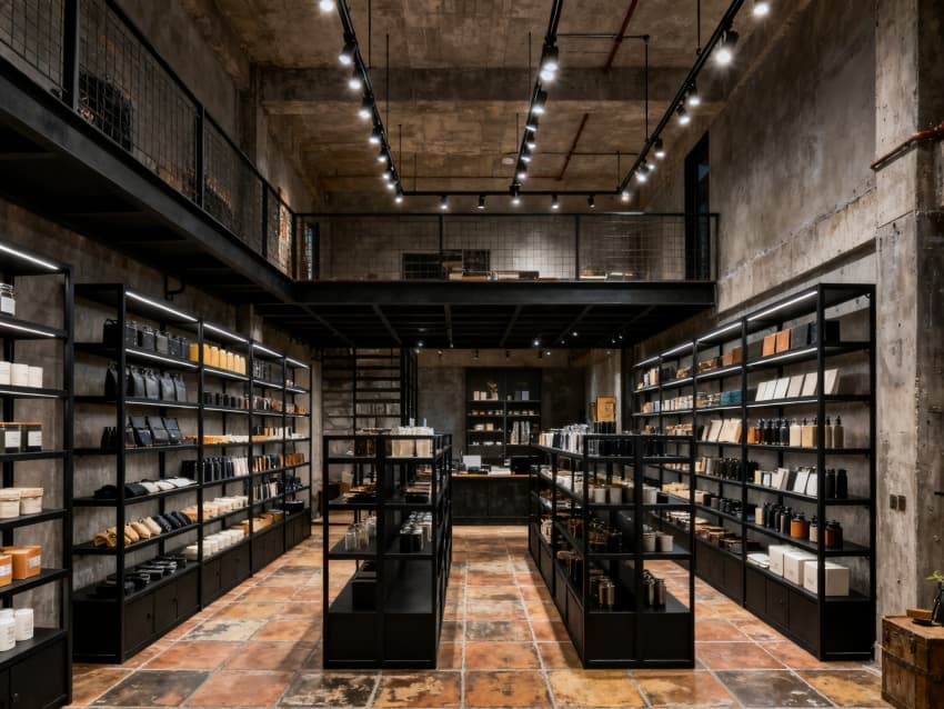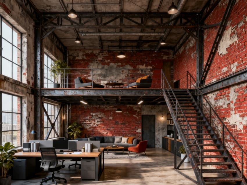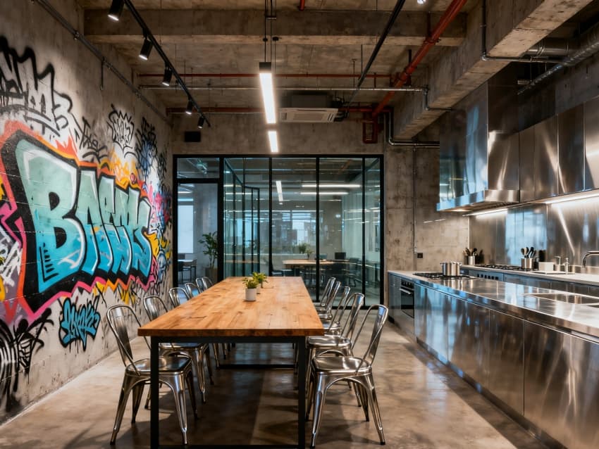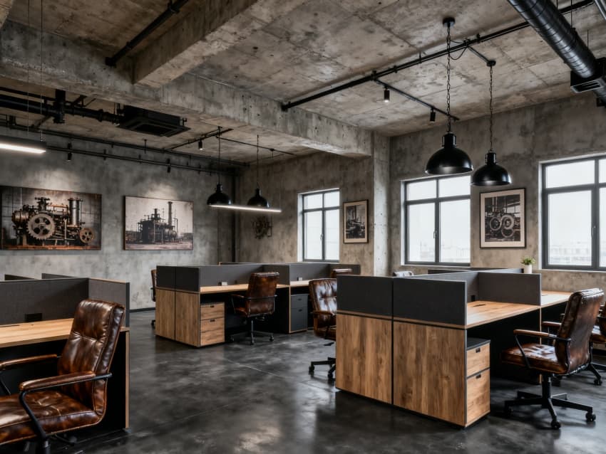 內(nèi)部設(shè)計(jì)緊扣“產(chǎn)辦協(xié)同與實(shí)用優(yōu)先”:生產(chǎn)銜接區(qū)(約800㎡)緊鄰廠房車(chē)間,設(shè)樣品展示區(qū)、物料臨時(shí)存放室與生產(chǎn)調(diào)度辦公室,地面鋪耐磨環(huán)氧地坪,墻面保留水泥肌理,搭配工業(yè)風(fēng)置物架,方便生產(chǎn)資料存取;核心辦公區(qū)(約1800㎡)設(shè)開(kāi)放式工位與獨(dú)立辦公室,裸露式吊頂保留管線(xiàn)并刷深灰色漆,淺灰防靜電地板搭配黑色金屬框架辦公家具,淺木色桌面中和工業(yè)風(fēng)的冷硬感;輔助服務(wù)區(qū)(約1100㎡)含會(huì)議室(2間,適配生產(chǎn)會(huì)議與商務(wù)洽談)、員工食堂、茶水間與衛(wèi)生間,會(huì)議室用金屬網(wǎng)隔斷分區(qū),食堂采用長(zhǎng)條混凝土餐桌,茶水間設(shè)工業(yè)風(fēng)金屬操作臺(tái),整體功能適配生產(chǎn)型企業(yè)員工需求。?