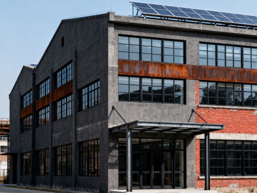 該3700平廠房辦公樓以“工業(yè)風(fēng)?產(chǎn)辦融合”為核心設(shè)計(jì)理念,聚焦廠房與辦公的協(xié)同需求,按“生產(chǎn)銜接-核心辦公-輔助服務(wù)”邏輯規(guī)劃空間,內(nèi)外風(fēng)格統(tǒng)一且凸顯工業(yè)屬性。外立面保留廠房原有鋼結(jié)構(gòu)框架,以深灰金屬漆翻新,搭配高透鋼化玻璃窗,橫向黑色金屬線(xiàn)條規(guī)整立面;入口設(shè)混凝土門(mén)廊與工業(yè)風(fēng)金屬大門(mén),門(mén)前預(yù)留貨車(chē)臨時(shí)??繀^(qū),兼顧辦公人員通行與生產(chǎn)物料銜接,門(mén)頭標(biāo)識(shí)采用金屬立體字,強(qiáng)化工業(yè)質(zhì)感。?