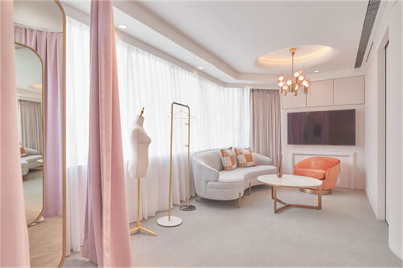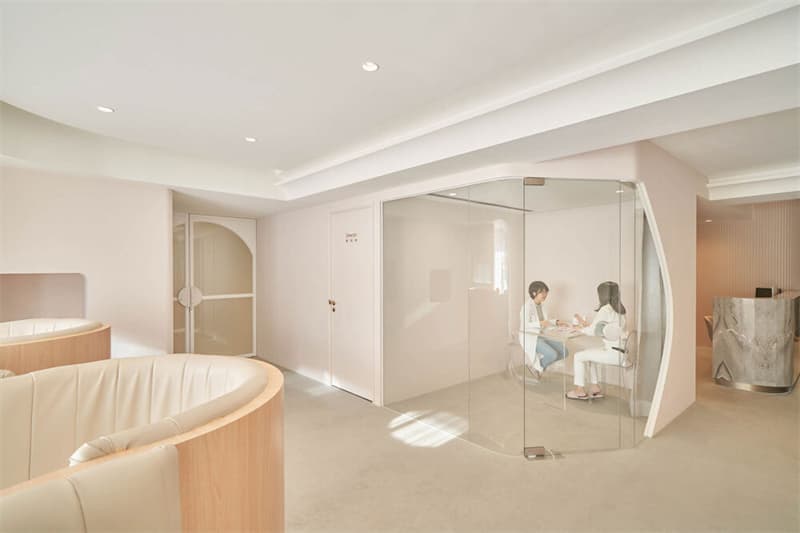 正當(dāng)你有些緊張地旋身投進(jìn)場域,倏忽開放而輕盈的空間,緩解了不少不安的情緒。圍繞四處的圓弧線條,代替空間方正的銳角,更取圓弧的面,制造出猶抱琵琶半遮面的優(yōu)雅與曖昧。而等候區(qū)的座位,巧妙運用了曲線的兩側(cè),體貼制造出隱而不蔽的適當(dāng)距離,人人皆保有獨立的隱密性,焦慮也不至于相互影響。畢竟熟稔后的女子,無論外在多么干練堅毅,始終還是需要私自擁抱他人與自己情緒的寸地。