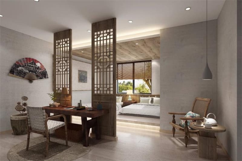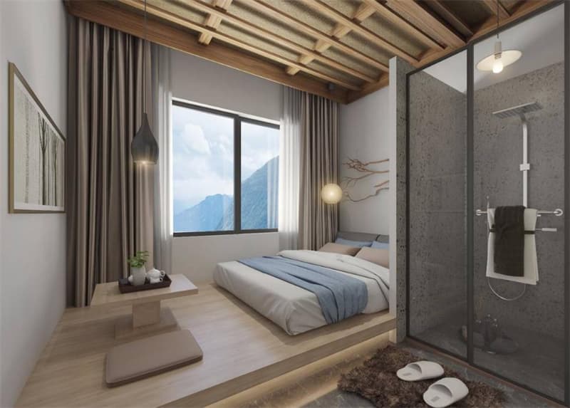 該民宿項(xiàng)目旨在重新定義奢華,創(chuàng)造慢節(jié)奏的空間,將室內(nèi)設(shè)計(jì)與室外景觀結(jié)合在一起。設(shè)計(jì)面臨的核心問題是如何在單一空間中創(chuàng)造的豐富有變化的尺度,從而給予民宿特別的生活體驗(yàn)。首先,空間關(guān)系的再造。功能的改變帶來了空間需求的變化。原有“住”的空間不再適應(yīng)民宿較高的空間使用效率和開放性需求,房間之間各自獨(dú)立的狀態(tài)急需改變,不同于日常生活的“宿”的空間需要被再造。其次,空間尺度的處理。通透的空間為尺度營造帶來了新的可能。營造一個(gè)具有尺度變化的“宿”的場所是對“身體性”的再次思考。再次,空間行為的限定。制造與日常生活相對的戲劇性要求設(shè)計(jì)進(jìn)一步定義“宿”空間中人的行為,創(chuàng)造既集聚又分離的空間,幫助新的、不可預(yù)期的行為自發(fā)產(chǎn)生。