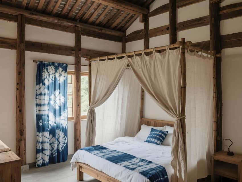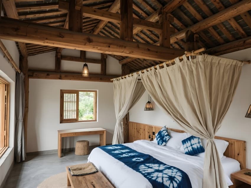 本案以"徽韻新生"為設(shè)計主線,將傳統(tǒng)村落肌理重構(gòu)為當(dāng)代避世桃源。建筑群依山就勢層疊分布,白墻黛瓦的坡屋頂與山巒輪廓呼應(yīng),門廊處的萬字紋鏤空花窗投射動態(tài)光影??头績?nèi)部采用抬梁式木構(gòu)架暴露設(shè)計,搭配亞麻帷幔與手工扎染軟裝,衛(wèi)浴區(qū)嵌入本地青石板砌筑的溫泉泡池。公共區(qū)域以"四水歸堂"天井為中心,懸浮茶亭下方流淌霧化水系,墻面裝置由村民舊農(nóng)具改造的藝術(shù)裝置。景觀設(shè)計運(yùn)用徽州"三層景"手法——前景油菜花田、中景水榭廊橋、遠(yuǎn)景黃山云海,通過智能霧森系統(tǒng)營造水墨氤氳意境,實現(xiàn)"人在畫中居"的沉浸體驗。