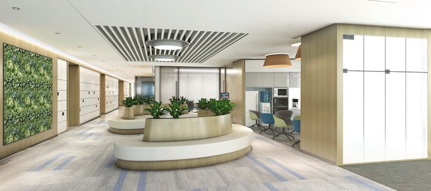 本辦公樓裝修項目中,接待大廳,會議中心,以及茶水間和共享辦公處,均安排了數(shù)字化的管理和設(shè)計。同時打破原來傳統(tǒng)的深色木飾面、奢華花色大理石設(shè)計風格,用了淺木色、白色大理石、科技感的陽極氧化鋁板和轉(zhuǎn)印鋁格柵,整體格調(diào)充滿高級感。一些工位設(shè)置共享工位,大大提高了工位的使用率。共享工位,可以設(shè)置很多的式樣:卡座、沙發(fā)、創(chuàng)意工位等,這樣共享工位不僅是工位,還可以是休閑討論區(qū)。會議區(qū)的模塊化設(shè)計,可移動式隔斷,充分滿足員工工作需求,進行合理分割。