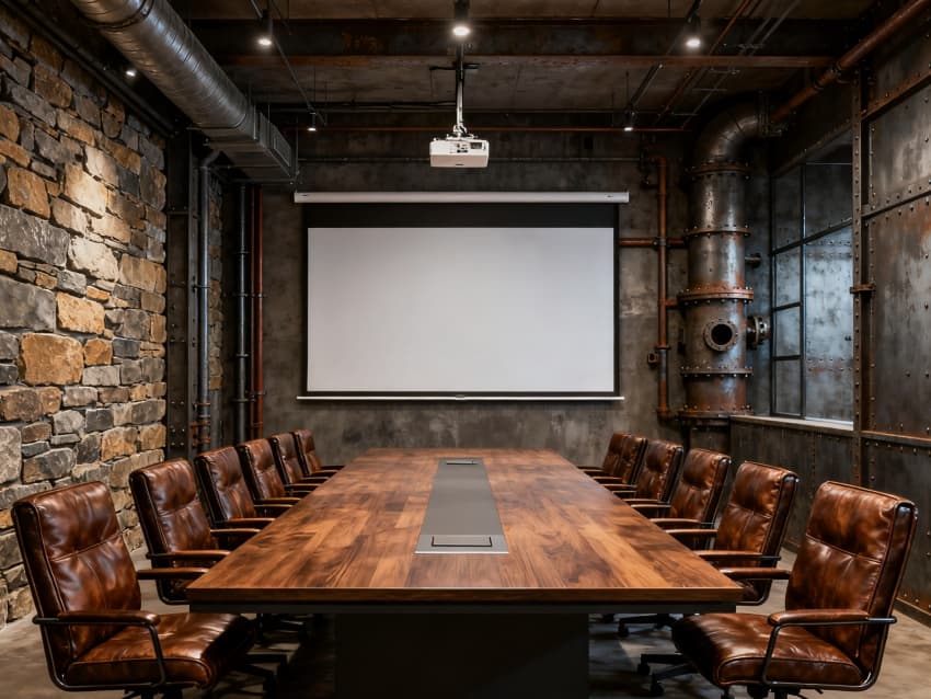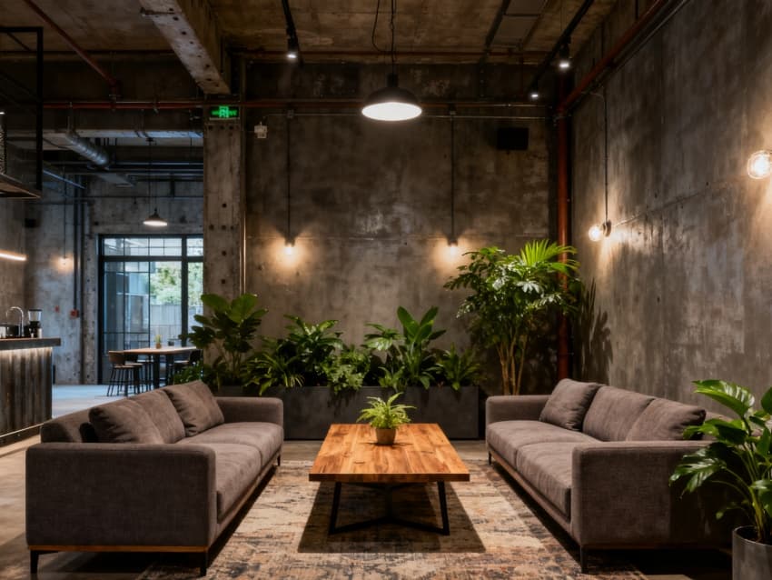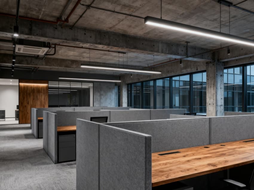 辦公區(qū)以淺灰地磚搭配白色墻面,黑色金屬辦公家具與裸露管線呼應(yīng),營造干練氛圍;會議室用深色木質(zhì)桌面搭配灰色布藝座椅,玻璃隔斷保證通透;休息區(qū)加入淺黃軟裝點(diǎn)綴,平衡工業(yè)冷感;走廊用線性燈與金屬扶手結(jié)合,增強(qiáng)空間縱深感;設(shè)備區(qū)則以實(shí)用為主,灰色儲物柜與淺色墻面搭配,整潔有序。整體通過材質(zhì)、色彩統(tǒng)一,打造出兼具工業(yè)特質(zhì)與舒適感的空間。