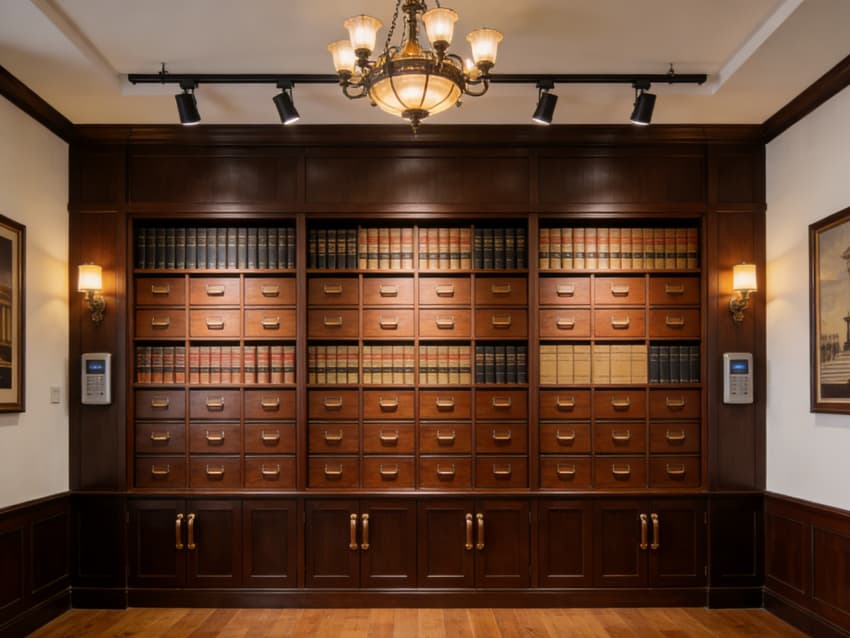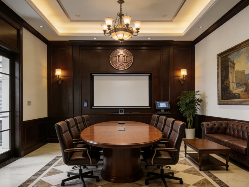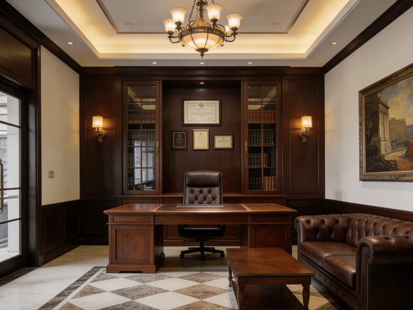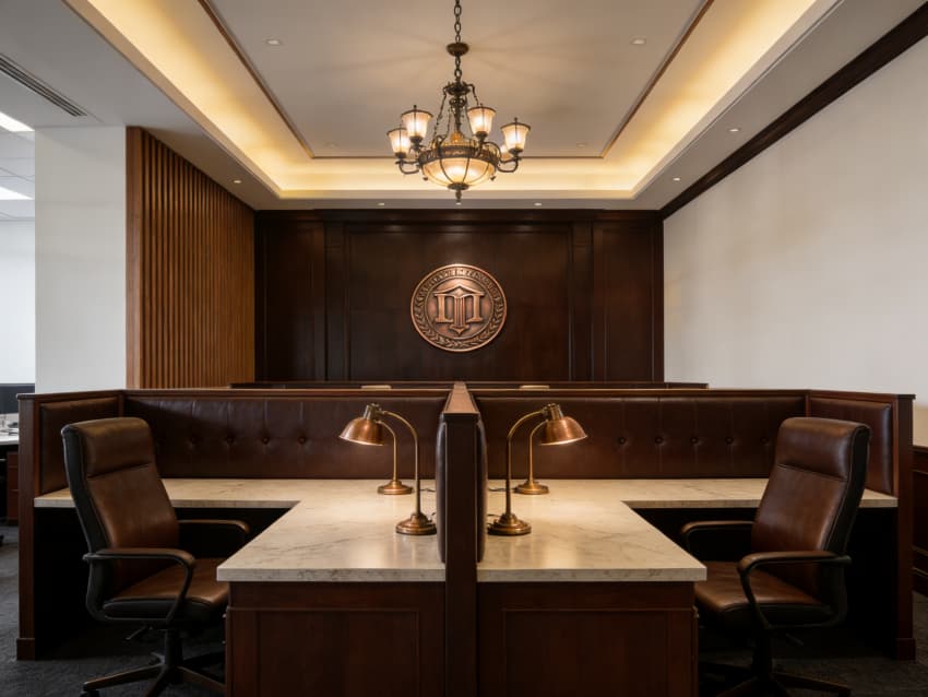 內部功能分區(qū)清晰有序,涵蓋大氣接待區(qū)、獨立洽談室、合伙人辦公室、開放辦公區(qū)、檔案資料室及多功能會議室。接待區(qū)以深胡桃木實木前臺搭配皮質沙發(fā),搭配復古地毯,營造莊重典雅的第一印象;洽談室采用隔音實木隔斷,保障咨詢私密性;會議室配備經典美式長桌與智能會議系統(tǒng),適配多人案件研討與商務對接。