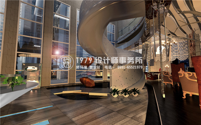 乳白色旋轉梯縈繞回轉,塑造了美妙的流動感。落地玻璃窗靈動通透,室內外燈光相會于此,一圈圈光暈隨之產生。