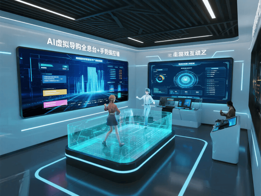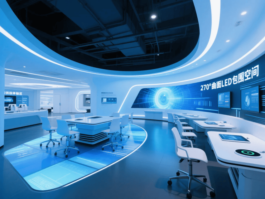 展廳以"數(shù)字共生·未來(lái)觸感"為主題,采用賽博朋克與極簡(jiǎn)主義的融合風(fēng)格。主色調(diào)選用科技藍(lán)、星際銀與暗夜黑,局部點(diǎn)綴霓虹粉與熒光綠增強(qiáng)視覺(jué)沖擊??臻g運(yùn)用流線型架構(gòu)與幾何切割形成對(duì)比,材質(zhì)上結(jié)合啞光金屬、霧面玻璃與全息膜營(yíng)造層次感。燈光系統(tǒng)采用隱藏式線性光帶與智能點(diǎn)陣光源,實(shí)現(xiàn)動(dòng)態(tài)氛圍切換。數(shù)字化交互貫穿全場(chǎng),通過(guò)AR增強(qiáng)現(xiàn)實(shí)、體感捕捉等技術(shù)強(qiáng)化體驗(yàn)沉浸感,同時(shí)保留充足的留白區(qū)域平衡科技張力。設(shè)計(jì)強(qiáng)調(diào)"人-機(jī)-環(huán)境"的三維互動(dòng),以未來(lái)感為核心卻不失人文溫度,最終呈現(xiàn)一個(gè)兼具先鋒性與功能性的電子科技展示空間。