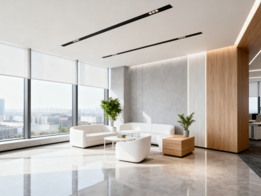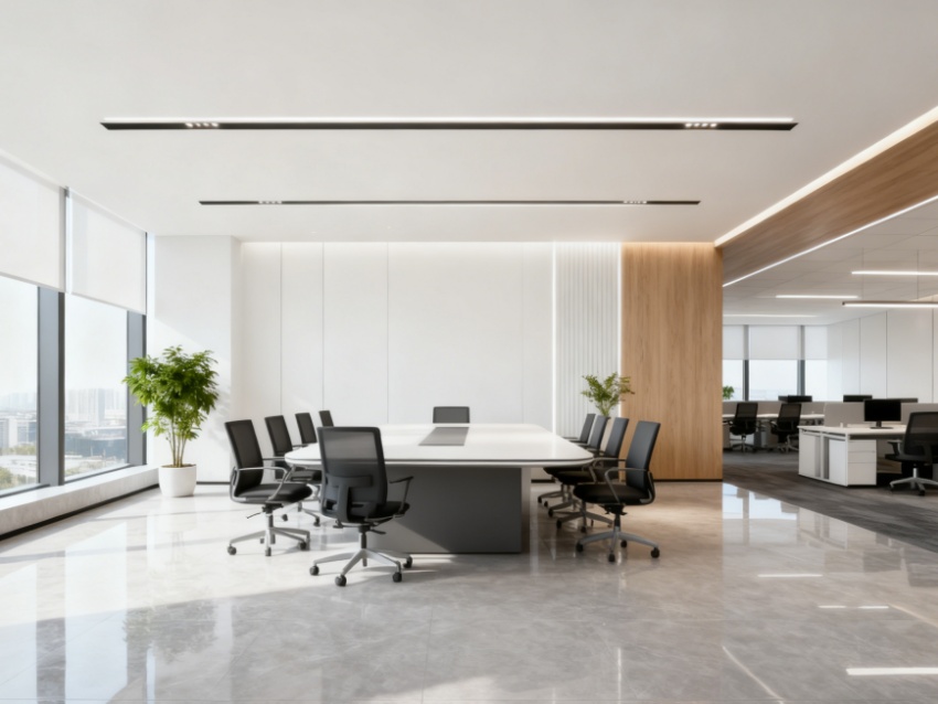 內(nèi)部空間遵循“功能優(yōu)先、分區(qū)清晰”原則,科學(xué)規(guī)劃開放辦公區(qū)、獨立辦公室、會議中心、休閑洽談區(qū)及配套服務(wù)區(qū)。開放辦公區(qū)采用模塊化布局,預(yù)留靈活拓展空間,滿足多人協(xié)作需求;獨立辦公室沿采光面排布,保障私密辦公體驗;會議中心配備智能影音系統(tǒng),適配不同規(guī)模會議場景;休閑區(qū)融入柔和軟裝與綠植,緩解辦公壓力。?