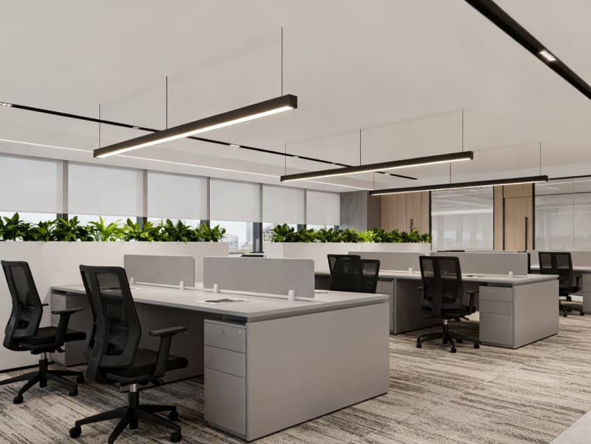 整體以淺灰、白色、淺木色為基調(diào),通過(guò)金屬線條、玻璃、環(huán)保板材等統(tǒng)一材質(zhì)貫穿空間,既避免功能分區(qū)導(dǎo)致的視覺(jué)割裂,又以輕量化設(shè)計(jì)讓2700平空間顯得通透寬敞,實(shí)現(xiàn)“高效辦公+舒適體驗(yàn)”的雙重需求,適配多企業(yè)聯(lián)合辦公或中大型企業(yè)獨(dú)立辦公的定位。